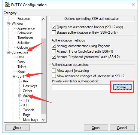 3、之后点击切换至“Connection”下“SSH”目录中的“Auth”功能页,点击“Browse”按钮,选择Putty密钥文件,之后建立连接即可。