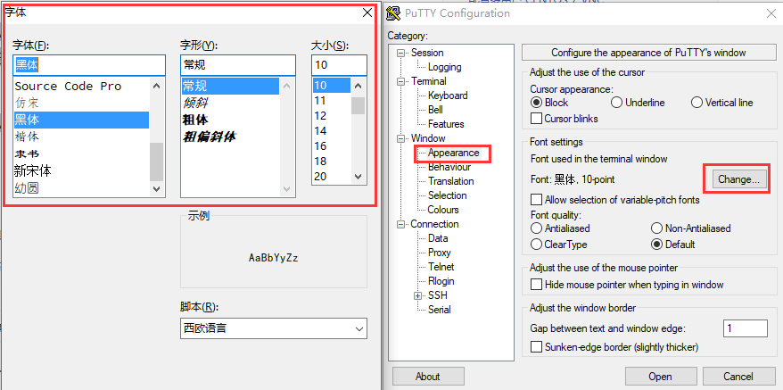 1、打开Putty,点击“Window”下的“Appearance”选项,点击“Font settings”后的“Change”按钮。这样会打开字体设置窗口,选择一款中文字体,然后在下方“脚本”栏中选择“中文_GB2312”。