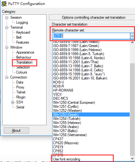 2、然后切换至“Window”下的“Translation”选项,打开"Remote character set"的选择框,在下拉菜单中选中"Use font encoding",之后在按照常规方式建立连接即可。