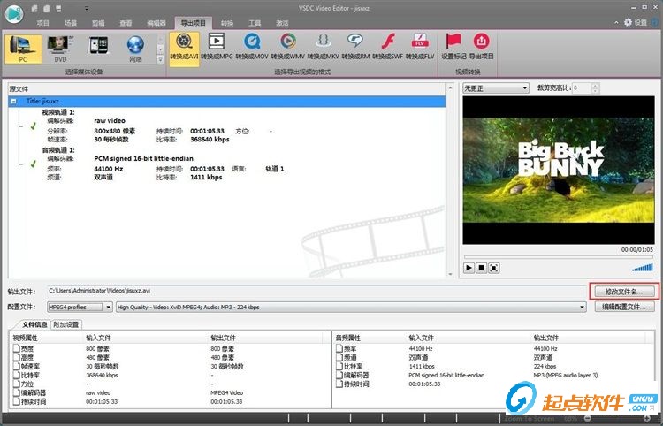 软件默认将视频项目输出位AVI格式的视频。软件设置好了视频的默认输出路径文件夹。我们也可以修改设置自定义视频输出路径。点击视频输出路径右边的修改文件名,打开视频另存为窗口;