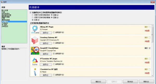 memoQ的机器翻译同样藏得很深,设计在了设置图标的选项里。虽然内置的机器翻译插件很多,但和Trados一样,大部分都是需要API的,这一点真不如国内的CAT,比如iCAT就可以直接用谷歌和有道翻译。