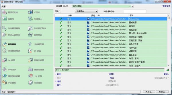 memoQ的资源控制台可以管理项目的所有资源,包括语料、各种规则(断句规则、自动翻译规则、导出路径规则)、QA和LQA、网络搜索设置、键盘快捷键等等。除了语料相关的设置比较容易外,其它的都非常复杂,需要根据英文版的“帮助”来进行设置。