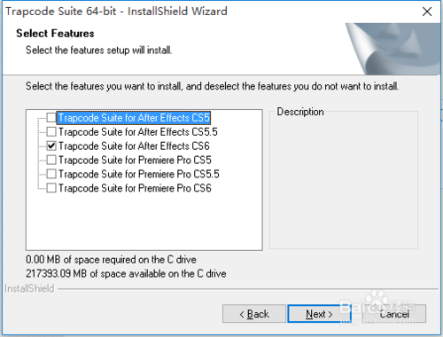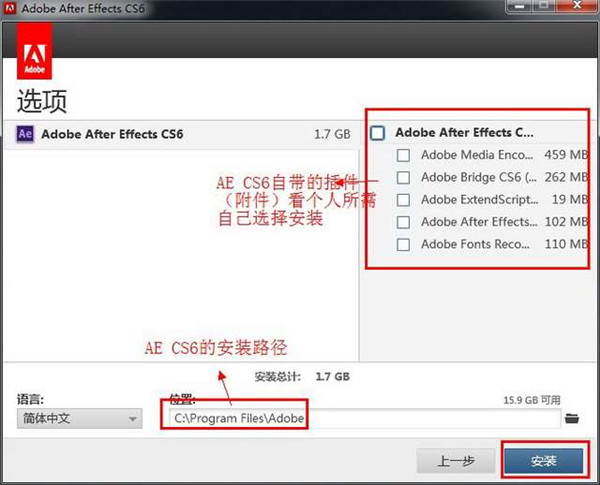 来到这一步之后,选择要安装的AE版本和安装的软件,在这里直接选择AE CS6,其它的都不选择,点下一步。