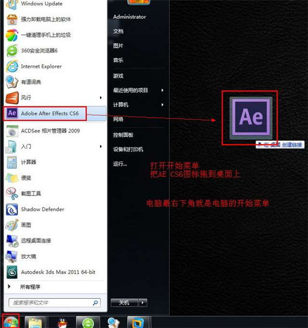 打开开始菜单把Adobe After Effects cs6【AE CS6】图标拖到桌面上(如果是XP系统,打开开始菜单-程序)。