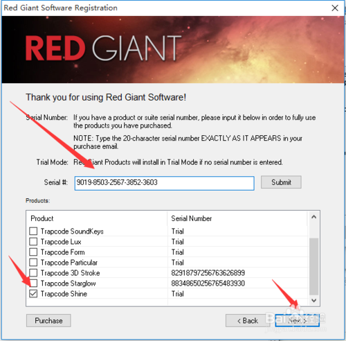 下载后打开安装包,开始安装,选择TrapCode Shine,输入注册码,选择下一步。
