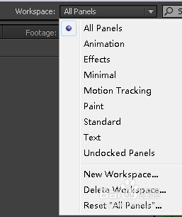 通过工具栏右侧的工作区域(workspace)下拉列表,可以选择不同的工作区界面模式,针对不同的额工作需要,合理分配面版的位置,从而提高工作的效率。
