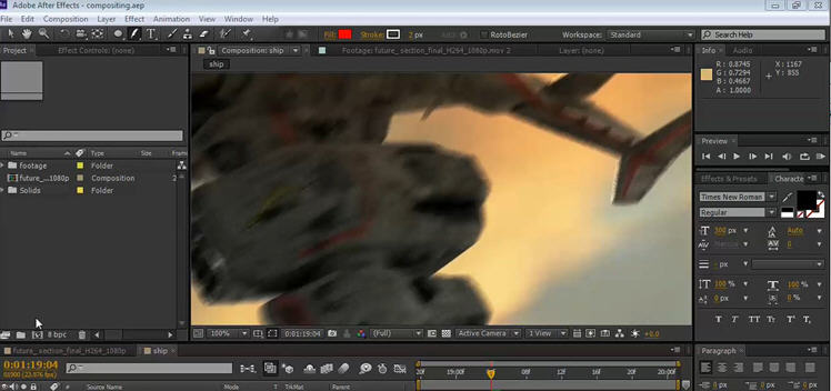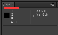 信息面板:主要用来显示光标子在视频中的相关信息,其RGB代表的是颜色,A代表光标所在位置的通道值。X和Y表示光标在屏幕上的位置。(和PS比较相似)该面板下方显示的所选对象的信息,包括当前层的名称、位置。持续时间。出点和入点等。