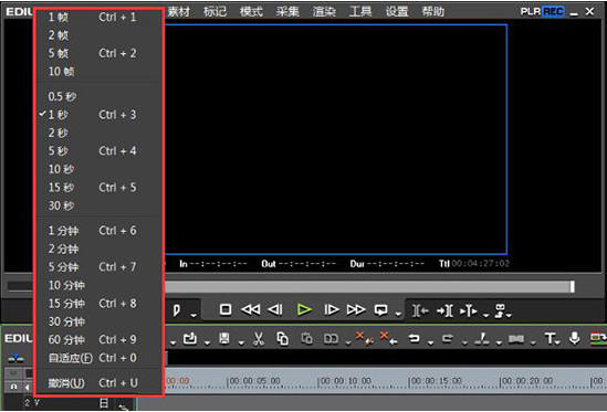 3、在弹出的下拉框中,可供选择的时间单位包括帧、秒和分钟,以及自适应;你可以选择1分钟,会看到EDIUS时间线长度确实缩短好多,这样编辑起来就容易多了。