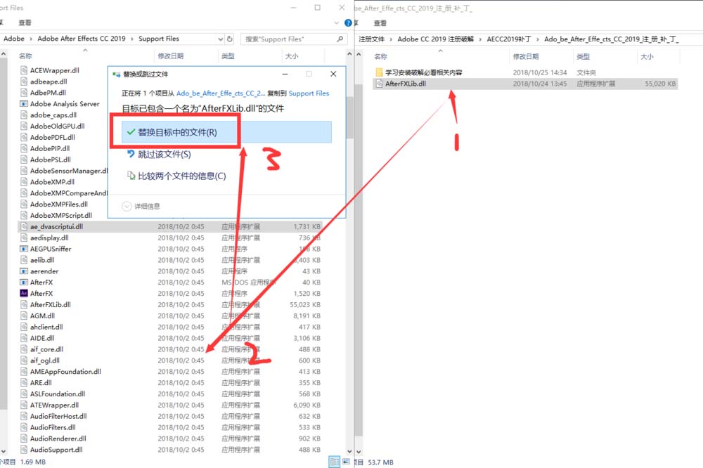 5、那么接下来我们就要进行替换补丁了,在安装包里面,有一个“学习安装必看文件”打开之后去下载注册补丁,把补丁复制到AECC2019根目录里面,切记是复制到根目录, 不是拖进去,否则无效。