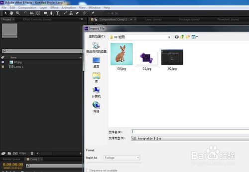 1、CTRL+I,导入视频。视频显示在文件面板中;鼠标点住视频素材拖到新建合成按钮,创建合成。