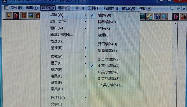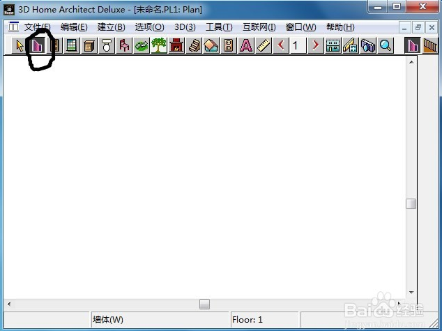 打开软件,直接进去画图模式,按住鼠标左键拖拽就可以画房屋框架了,一般都是先画方框。打开的界面上方,最下面一排第二个按钮就是墙体按钮,也可以在(建立)选项中选择不同的墙体,点击后,可直接点击鼠标左键画图。