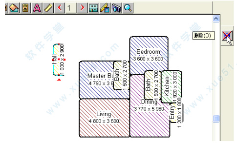 对不需要的房间,可以将其选中后按“delete”键将其删除,也可以用“编辑”菜单中的命令删除或用快捷工具栏中的按钮删除,如下图所示: