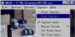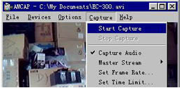 1首先启动AMCAP软件,用手按下摄像头顶部的按钮也可以启动该软件.录像过程分两步进行:先通过主菜单“File/SetCaptureFile”命令设置好录像文件的保存路径,再单击“Capture/StartCapture”命令即可开始录像了。