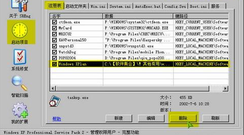 在SREng中"启动项目""注册表"鼠标左键在对应要修复的项上单击然后点击"删除"
