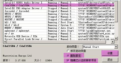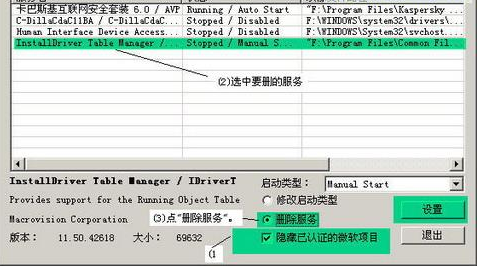 (勾选隐藏已认证的微软项目),选中有问题的服务后,点“删除服务”,点“设置”按钮即可。