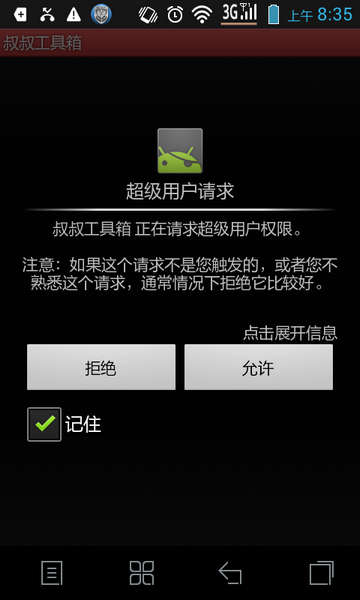 1、首先我们需要将下载来的第三方Recovery放入手机SD卡,然后在手机上安装移动叔叔工具箱。安装好以后继续打开软件,授权管理提示需要最高权限,点击授权即可。如图: