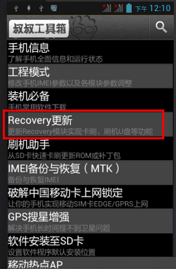 最简单的方法,根据下面方法的第一、第二和第三步,把flash_image拷到system/bin目录,赋予权限后,安装移动叔叔MTK工具箱,就可以直接用SD卡上的recovery文件更新recovery了。移动叔叔MTK工具箱也是调用flash_image这个命令,如果是官方的ROM,或者没有flash_image的ROM,移动工具箱就会出错。