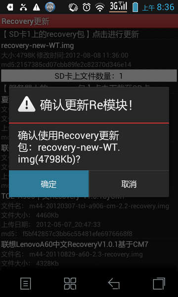 3、然后找到选择我们放入手机SD卡里的IMG格式Recovery,提示更新点击确认就行了。