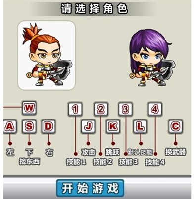 键盘AD键控制人物左右移动,W键传送,S键拾取物品,J键攻击,K键跳跃,H,U,I,O键技能,L键切换武器(切换武器可以使用不同的技能)。