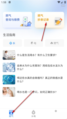首先点击【燃气】选项,随后点击【燃气抄表记录】选项。