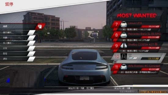 下图是游戏的主界面,右侧的是最高通缉的排名例如我就在第十位,积累到SP值可以超越黑名单中的其余选手并获取他们的车辆,得到SP值的方法很多,可以通过比赛、警察追逐,毁坏公关设施、特技跳跃、撞广告牌的方式赚取。界面的左侧是主菜单。下方的滚动条类似新闻联播的即时信息,但需要联网。