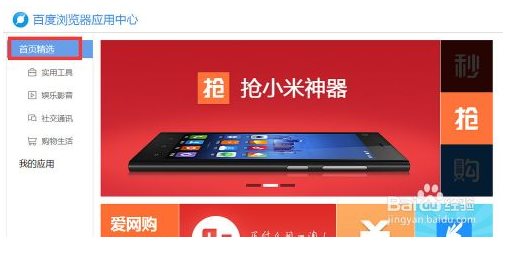 2、接着在打开的“百度浏览器应用中心”界面中,找到“首页精选”选项卡中的“抢小米神器’页面链接进入。