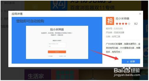 3、在打开的“抢小米神器”详细页面中,点击右下角的“安装”按钮,将该插件安装到浏览器中。