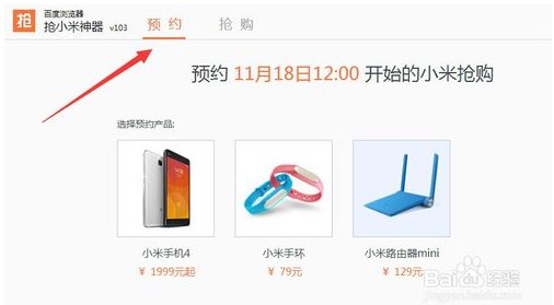 5、在打开的“抢小米神器”界面中,从“预约”导航栏中选择要预约的产品,比如小编选择“小米手机4”。