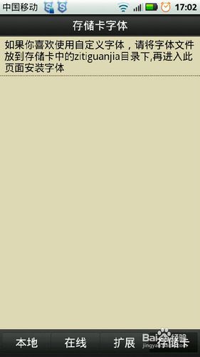 如果没有喜欢的字体可用,就从网上搜索喜欢的字体,然后在内存卡根目录下新建一个文件夹zitiguanjia,然后粘贴进去,就可以在字体管家主界面的“存储卡”上找到字体文件了:
