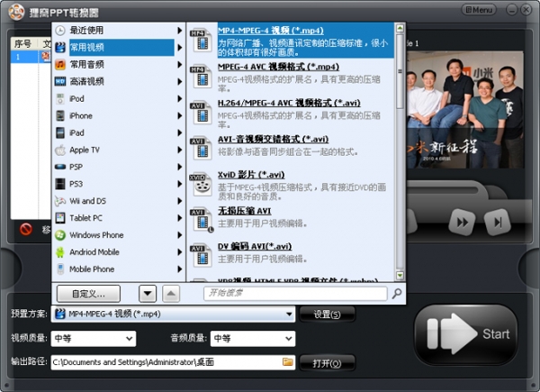 输入格式:ppt、pptx输出格式:AVI、WMV格式、MPEG、FLV格式、MP4、vob、3gp、3g2、MOV格式、ipod、iphone、psp、pmp等等常用流行视频格式。