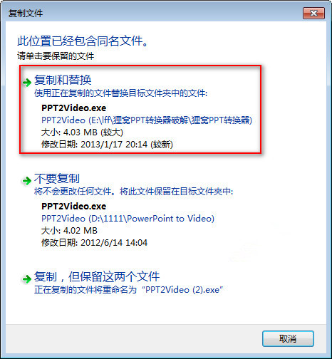 下载完的压缩包里有两个文件,一个是安装包,一个是破解文件。直接把破解文件"PPT2Video.exe"覆盖安装根目录下的文件即可,已经去除了原版的联网验证了。