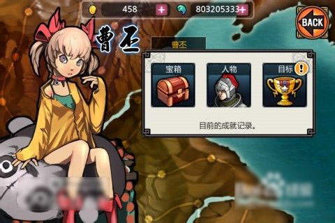 这个系统算是本作的收集与成就奖励系统,共有三个选项:宝物、人物以及成就。宝物是在每场战斗之后开宝箱可以随机获得,也可以用100金币进行搜索。收集满一栏(一栏四个)即可获得那栏最后对应的奖励项。人物则是你在平时游戏中进行佣兵搜索所找到的人物(连着一开始的李典,一共有30个不同的魏势力武将),算是一种变相的收集系统。而成就系统,达到一定目标则有相应的奖励,一般都是奖励金币,也有奖励蓝玉的。顺带吐槽一下,这里的曹丕是全游戏唯一一个小萝莉,而且偏向哥特风。