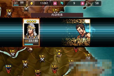 在武将界面,可以选择【HP恢复】、【占卜师】、【内功传承】。其中【HP恢复】是恢复武将的血量(每个关卡结束后,武将血量不会自动回满);【占卜师】是查看武将的属性倾向;【内功传承】是通过消耗其他武将来提升指定武将的等级。