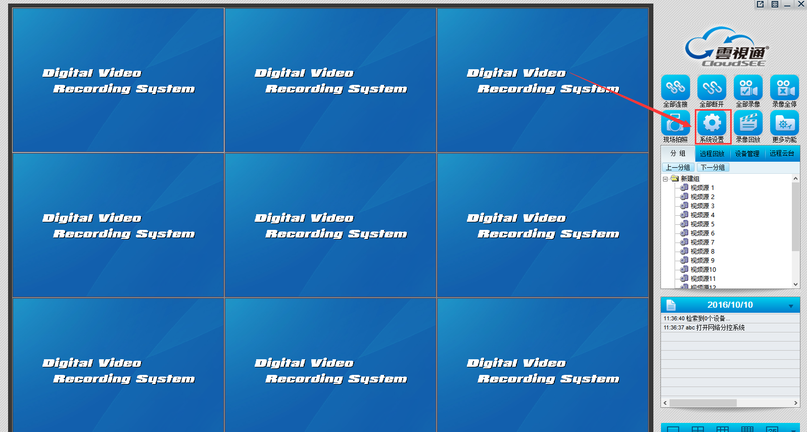 3、点击右侧菜单栏里的【系统设置】功能按钮,进入系统设置界面,通过该界面可以设置视频源及分组,用户,存储等,如下图所示。