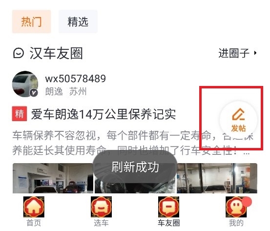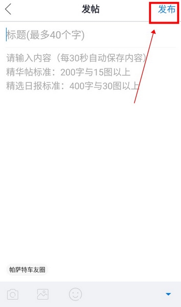 2. 在【车友圈】页面,点击下方的【发帖】,就能进入帖子编辑界面。