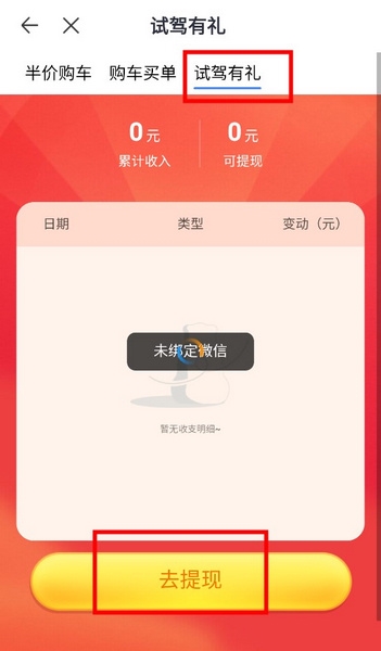3. 在跳转页面里,选中【试驾有礼】,就能看到【提现】按钮。待金额满足提现条件,用户便可一键完成提现。