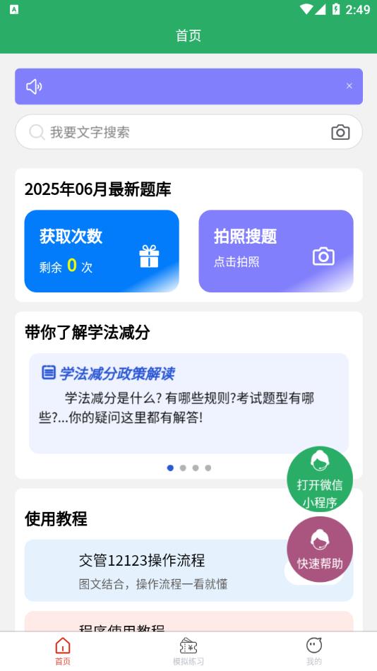 学法减分拍题神器,这是一款聚焦驾考知识领域的学习软件。它一心专注于驾考知识,为用户打造便捷的掌上学习服务平台,旨在助力用户顺利通过考试从而实现减分。该软件具备诸多实用功能,像海量的题库资源、详细的题目解析,还有方便快捷的拍照搜题功能,这些功能能让用户的学习过程变得更为轻松高效。对于那些需要参加学法减分考试的驾考用户而言,这款软件无疑是不可或缺的学习工具。