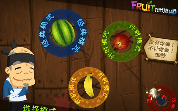 1、经典模式:在经典模式中无时间限制,水果和炸弹会不断浮动出现在屏幕上。玩家共有三次因没有切到水果而失误的机会,而只要一切到炸弹游戏就会马上结束。每积累到100分就会自动补充一次以前失去的机会。此模式中会随机出现石榴(连切来加分,分数高低,取决于玩家切的速度)、火龙果(切掉可以+50分)和杨桃(切掉+150;175;200分,分数高低随机)。