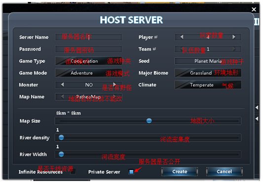 可能用0.83以前版本的同学和这个不同对照自己找找吧,比较重要的是下面的服务器是否公开,一定要把那个蓝点取消掉,不然在大厅是看不到你的服务器的