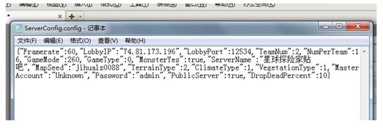 {"Framerate":60,"LobbyIP":"74.81.173.196","LobbyPort":12534,(前面不要动)"TeamNum(队伍数量)":2,"NumPerTeam(每队几人)":16,"GameMode(游戏模式260建筑261冒险)":260,"GameType"(游戏形式:0是冒险1建筑2是生存):0,"MonsterYes(是否有怪)":true,"ServerName(服务器名字)":"星球探险家贴吧","MapSeed"(游戏种子,种子就是随意打的字符):"jihualz0088","TerrainType"()地形:2,"ClimateType"(环境):1,"VegetationType"(环境什么的):1,"MasterAccount"(不用管):"Unknown","Password"(密码):"admin","PublicServer"(是否公开服务器):true,"DropDeadPercent"(巴拉巴拉不用动):10}