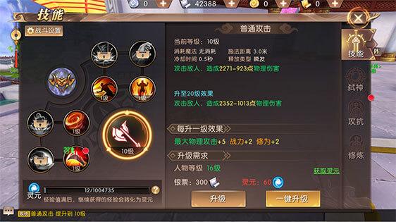 常规技能:共4个,通过角色等级成长开启,消耗灵元成长,每提升10级获得技能效果进阶;