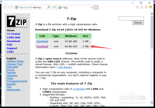 如果电脑上还没有安装7zip软体,可以到本网站下载,下载前请首先确认你所使用的电脑是32位系统还是64位作业系统。如果你当前使用的是64位操作系统,但是下载的是32位版本7zip,则无法关联右键菜单,但可以关联文件。