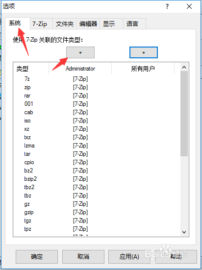 在弹出的对话框中,选择【系统】属性页,此页设置文件关联,点【+】按钮可以建立关联。