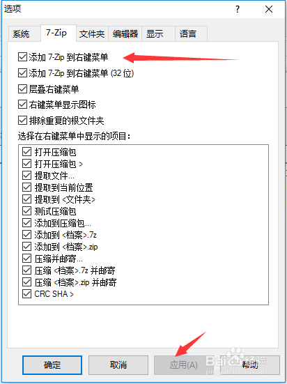 选择【7zip】属性页一栏,勾选“添加7-zip到右键菜单”,然后点“应用”按钮。