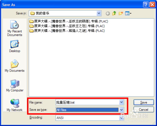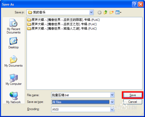 在“保存类型”选择所有文件,然后命名为:“批量压缩.bat”。