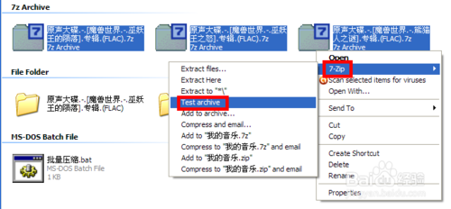 核对压缩文件的完整性。选中新生成的那几个文件点击鼠标右键,在弹出的菜单中选择7zip,然后再弹出来的次级菜单中选择“测试文件”。