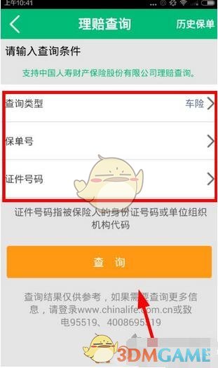 进入查询界面,选择查询类型,可通过保单号、证件号码进行查询。本查询支持中国人寿保险股份有限公司理赔查询,其中证件号码指被保险人的身份证号码或单位组织机构代码。