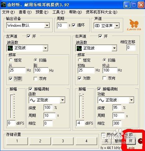 3、首先按照顺序设置低音域设置,然后点击开。将耳机插到电脑耳机孔。然后调整音量大小(音量不要太大,和平时听歌声音差不多即可)。另外煲机并不是一个固定值个人可以给你一个建议,就是听一下该音域声音是否满意,不满意煲机3到4个小时左右,然后再听听效果,以此类推等该音域流畅了,再进入下一音域(新耳机煲机要比较久,声音干涩的话第一阶段可以放久一点8个小时左右,然后再间隔试听)。