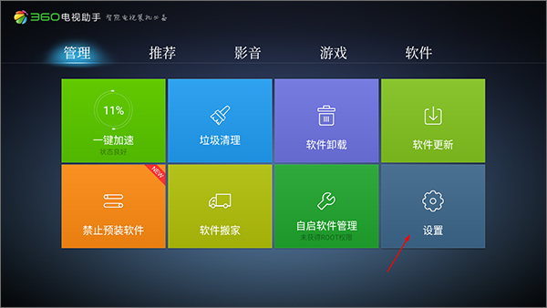1、用户在本站下载360电视助手tv版软件,并将其安装到电视上。打开软件后进入推荐页面,在此页面,用户能够对电视进行加速与垃圾清理操作,点击“管理”。