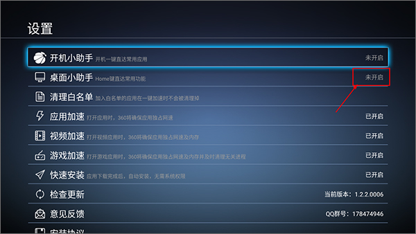 3、用户打开设置页面,开启桌面小助手后,就能在电视首页设置密码。